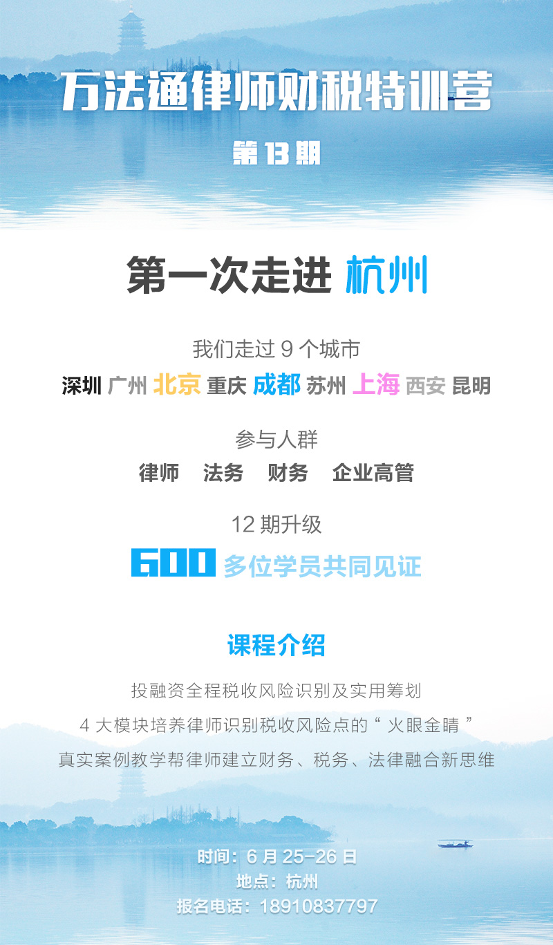 | 9:00-12:30 | 1.股权转让的风险与筹划” (1)股权转让涉及的相关税收 经典案例: 亿元股权转让税收0元是如何实现的 (2)哪些行为按照股权转让所得征收所得税 (3)股权转让收入是指拿到钱么 (4)如何界定收入明显偏低且无正当理由 (5)税收上的正当理由 (6)你真的会用正当理由进行筹划么 (7)什么样的股权转让会被税务机关核定征收 (8)用一张图教你计算股权转让的税收 案例教学:一个案例讲述投资全过程的税收 经典案例:只需一分钟,让你的律师服务价格提升4千万 2.股权转让可以实现不交税么? 3.新三板、IPO挂牌前的税收分析与筹划 (1)财务九大坎的识别 (2)税收十一坎的合理筹划 |